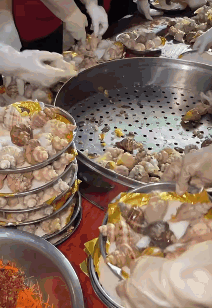 一场合格的大席,必然是汇集了当地美食之精华。北方大席吃碳水,东南沿海酒席尝海鲜。据说,有的大席菜不仅属于流水席师傅的独门绝技,比外面馆子里的还好吃;而有的传说中的菜色,因为做法复杂,一般饭店不卖,只有大席上才有。