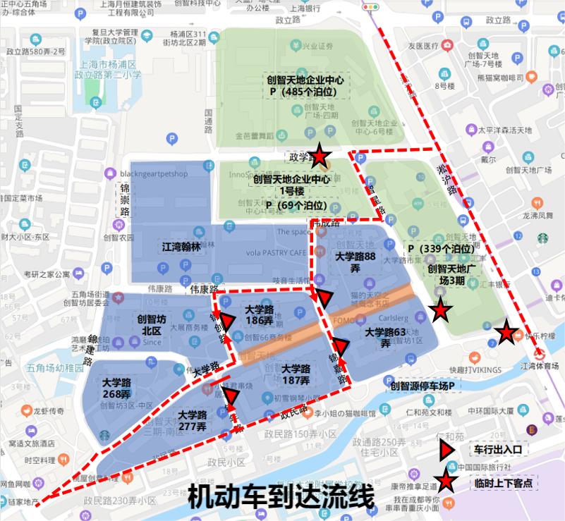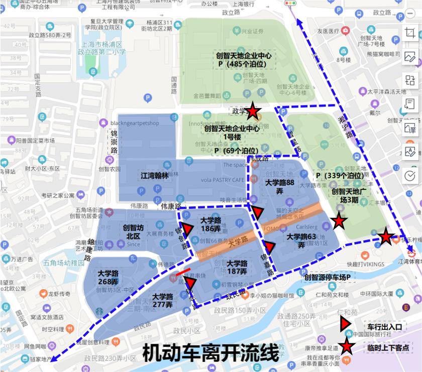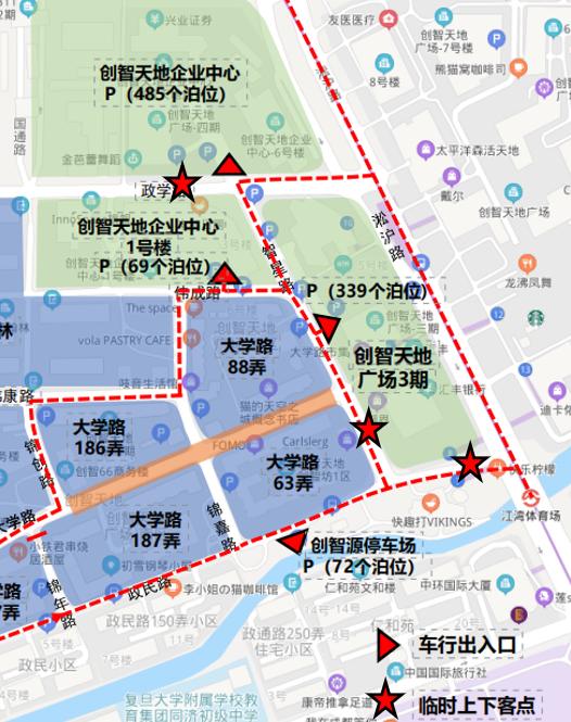 车辆有临时上下客需求的可在“出行地图”上标注的智星路、政学路、政民路等“临时上下客”点即停即走。