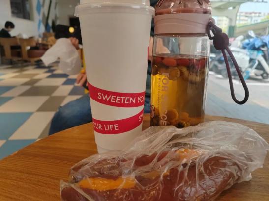 2号阿姨当天的午饭是自带的红薯除了下雨天不出门,其他日子,她像上班一样来85度C打卡,和店里的营业员也都熟了。“她们态度都蛮好的。”店里会有新品试吃活动,营业员端着盘子给大家试吃当天的新品,鸡肉披萨面包。