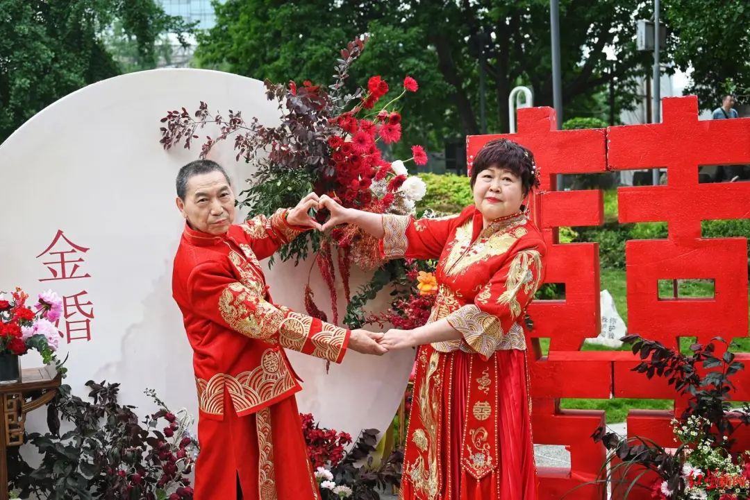 5月20日,一场特殊的金婚庆典在成都市锦江区举办,参与活动的5对金婚伉俪身着隆重的中式婚服,在亲友和观众的共同见证下,一起重温这五十多年的时光岁月。