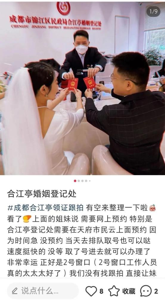 3月31日,一位网友在网上分享自己前往合江亭婚姻登记处领证结婚的经历。网友表示,在办理登记过程中,2号窗口工作人员的热心服务给他们留下了深刻的印象。虽然当天两人分别穿上了婚纱和西装,但并没有安排跟拍人员,只是让家人帮忙拍照纪念。见到这种情况,2号窗口工作人员主动教他们该如何摆造型,教家人如何取景,帮忙拍摄两人领证的照片,并告知登记处内从哪个地方开始拍摄、哪些地方好看等。