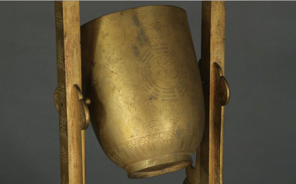 细节这件铜镀金戒盈持满上有很长的铭文,详细介绍了“满招损”的内涵,其一面铭文曰:“孔子观于周庙,有欹器焉。孔子问守庙者曰:此为何器?对曰:盖为右座之器。孔子曰:吾闻右座之器,满则覆,虚则欹,中则正,有之乎?对曰:然。孔子使子路取水而试之,满则覆,中则正,虚则欹。孔子喟然叹曰:呜呼,恶有满而不覆者哉!”