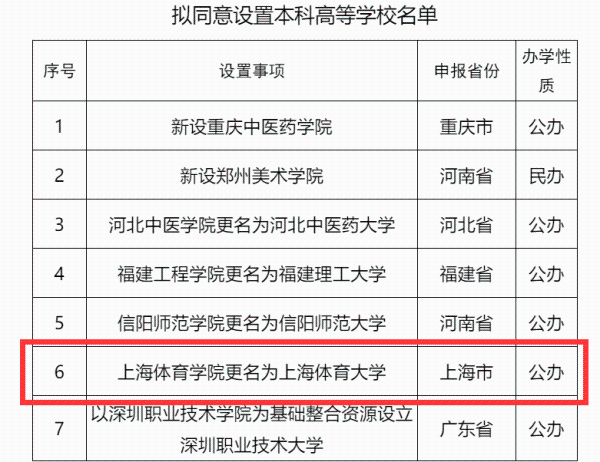 5月22日,教育部官网发布消息,根据《中华人民共和国高等教育法》《普通高等学校设置暂行条例》《普通本科学校设置暂行规定》《本科层次职业学校设置标准(试行)》等法律法规和规定,经第八届全国高等学校设置评议委员会专家考察评议,教育部党组会议审议,拟同意上海体育学院更名为上海体育大学,并现予公示。