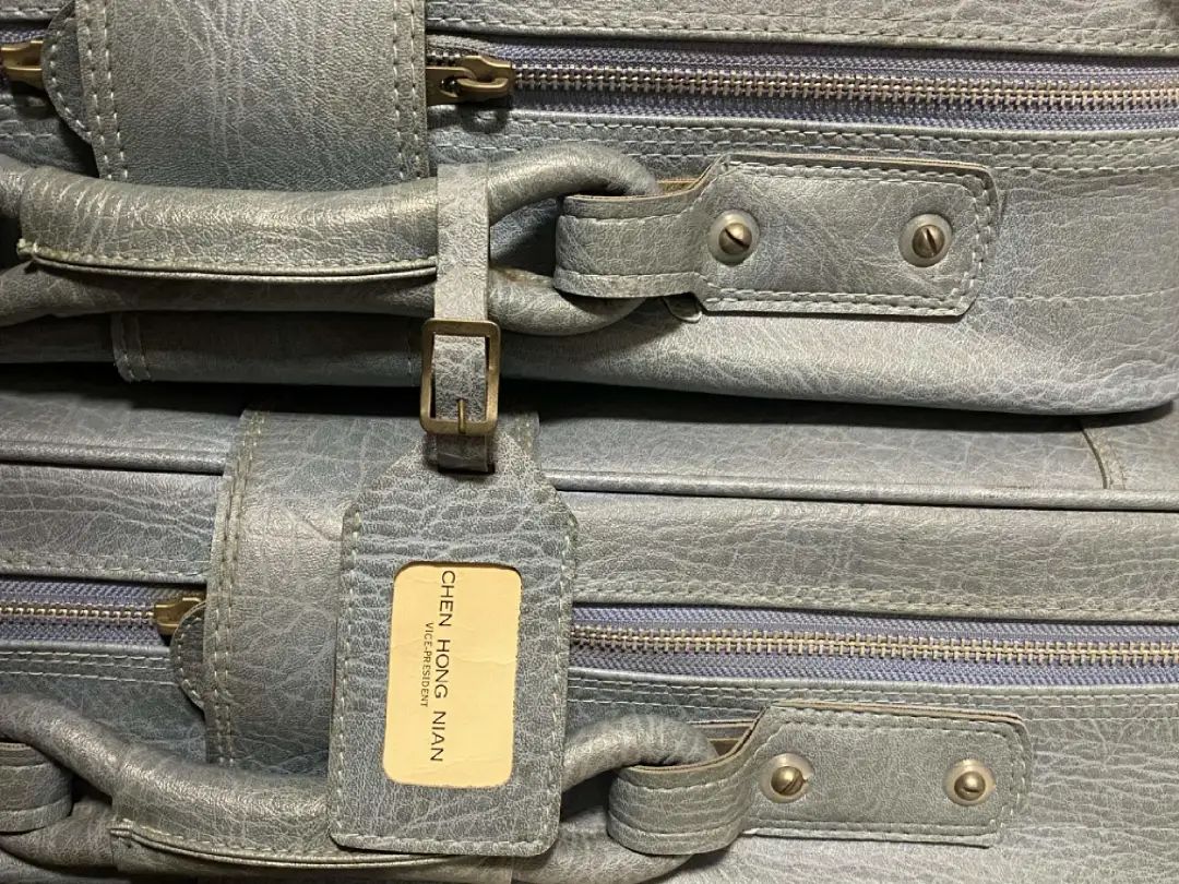 皮箱是湖水蓝的,两只大小稍有不同。因为箱子表皮和周围略微有些泛白,看得出是有些年头了。上面挂着的一把小锁,虽然已经褪色到看不清它本来的样子,但还能打开,里面的内衬是格子图案的布料,箱子的四角是用类似垫板的塑胶片撑起来的,细看可能略显简陋,可是在我开箱之前,它们却是扎扎实实地撑着皮箱,十分挺括地扮演着支柱的角色。