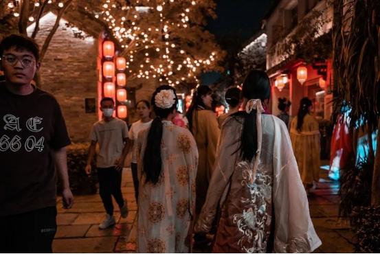 夜色融融,在红色灯笼的掩映下,行走在回龙窝历史文化街区,感受这里的古韵悠长、巷弄深深。身着汉服的年轻人踏着青石板路,纷纷在青砖灰瓦旁打卡留念。