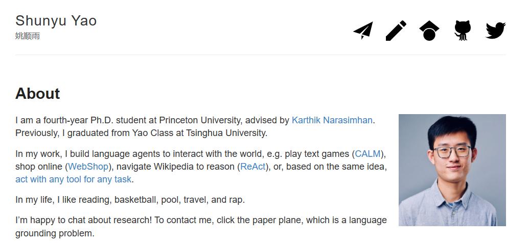 第一作者Shunyu Yao,是普林斯顿博士,本科毕业于清华姚班(2005建成的计算机科学实验班,人称清华最厉害的班级,云集了计算机领域的金字塔尖人才)。