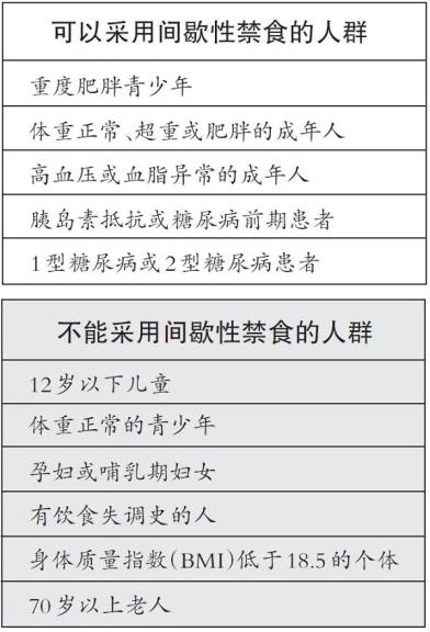并非人人适合那是不是所有人都适合用间歇性禁食来减重呢?当然不是。大家可以看下面这个表中的适用人群和禁忌人群。当然,也不是根据这个表就可以直接盲目地去禁食,而是要先咨询专业的医生或营养师。