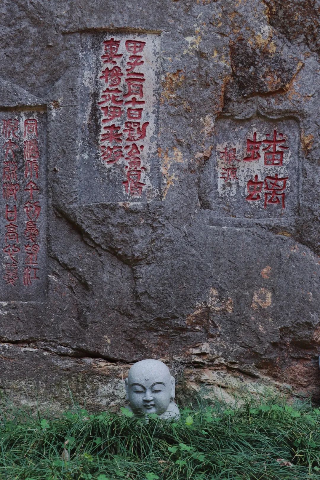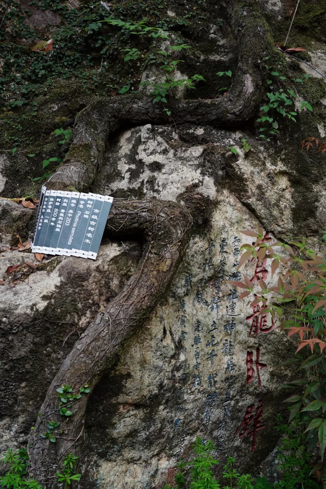 跨入山门,我们不待欣赏矗立在左侧的一雌一雄的两棵约500岁的古银杏,直奔古石楠而去。从大殿正门的右侧步行数步,再左拐进入小道,迫不及待闯入视线的是身侧陡壁三十余方的摩崖石刻,南怀瑾、弘一法师、星云法师、章太炎等大家/大师皆在此留下笔墨痕迹,在此刻,我们有幸与他们进行了跨越时空的相逢。