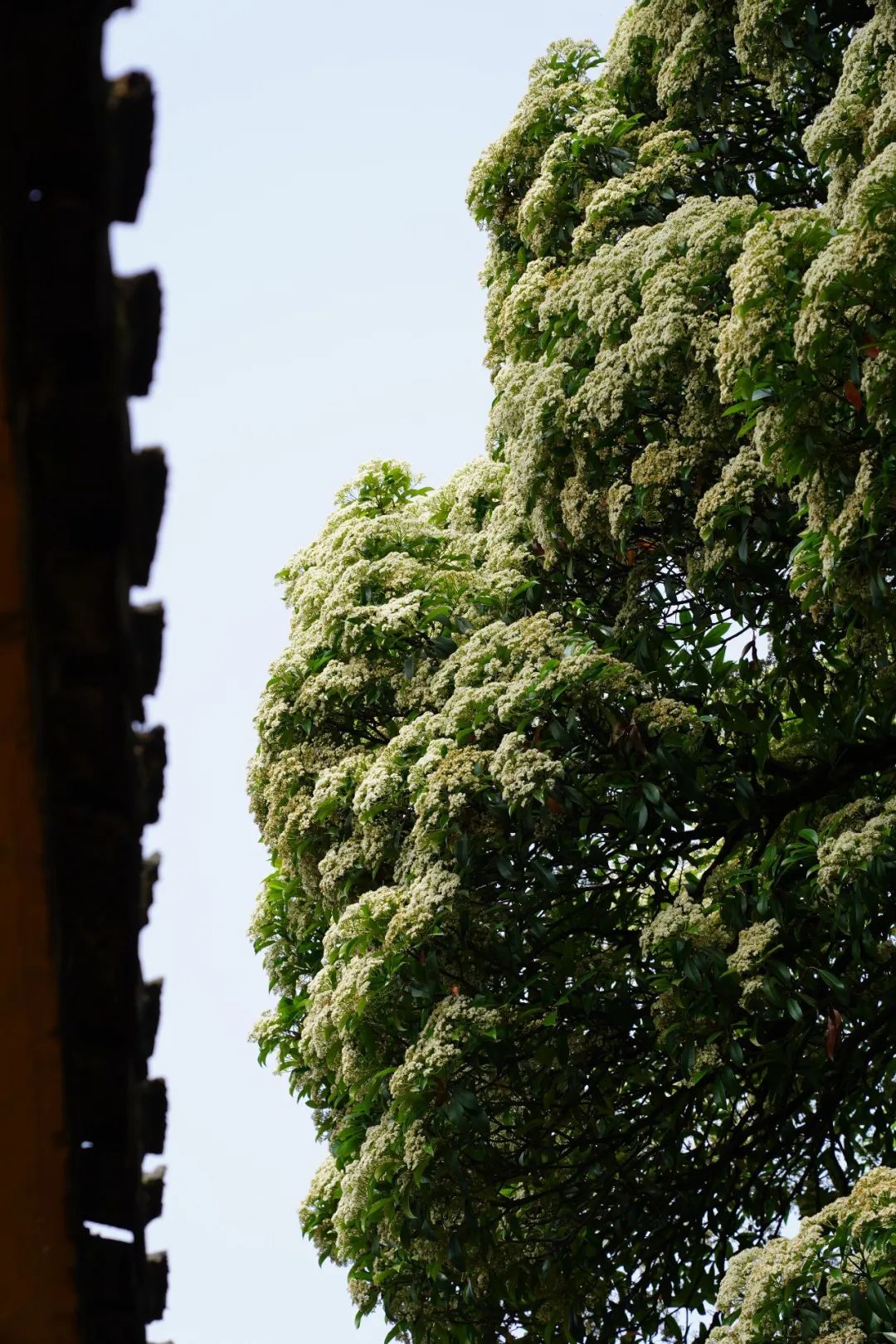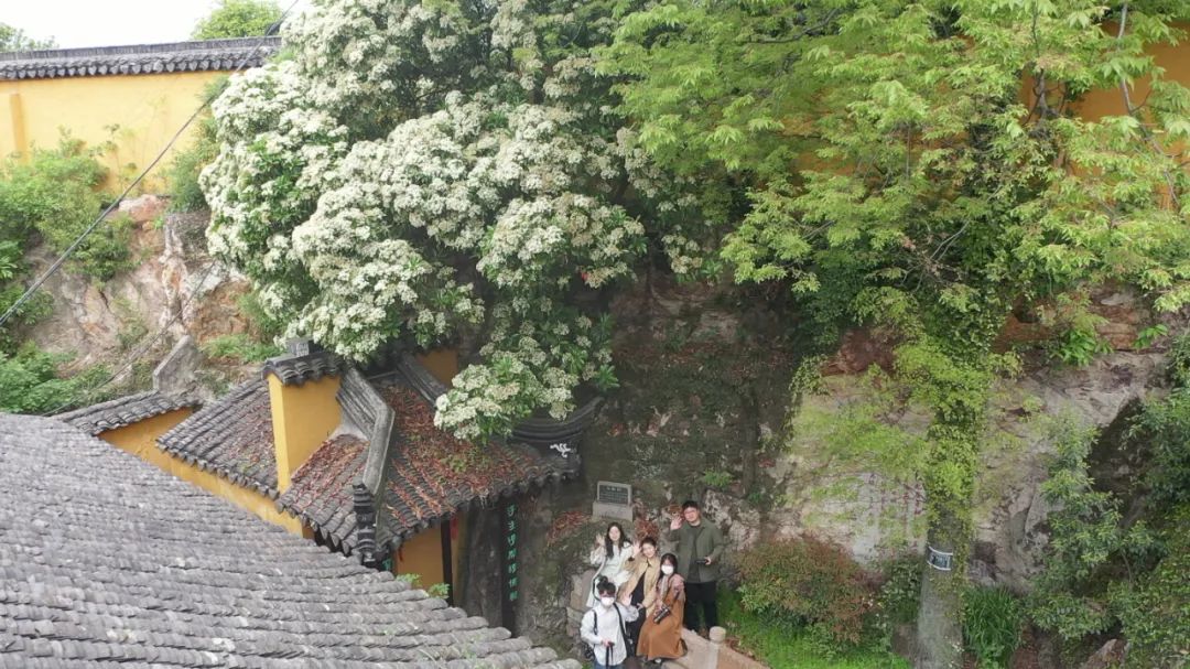 我们见时,石楠花最繁盛之期已过,色已微微泛黄,但时来的风裹挟着他的味道仍让人觉得不适,拂了还满的石楠花沾惹在我们身上,似乎找不到东坡“簌簌衣巾落枣花”那样的意趣。但通过航拍全景,我们发现这棵藏拙于寺庙后壁的古石楠非常像一颗青白相间的“花椰菜”,不免也觉得他此时平添了几分可爱。除此之外,我们也关注到科普博主讲石楠除了短暂的花期会给人带来困扰外,全身都是优点,易种植、易养活、能净化空气、便宜、生长速度快,可以说是最佳的行道树之一。人尚且无完人,我们又何必去苛责一棵树的微瑕呢?