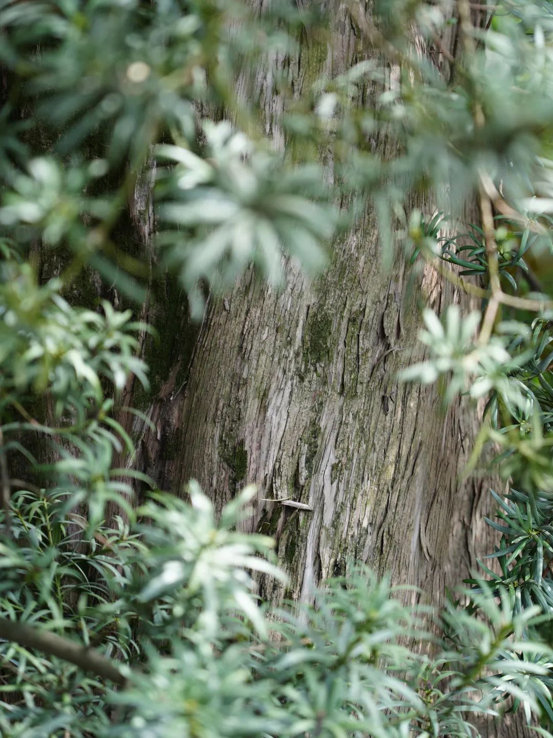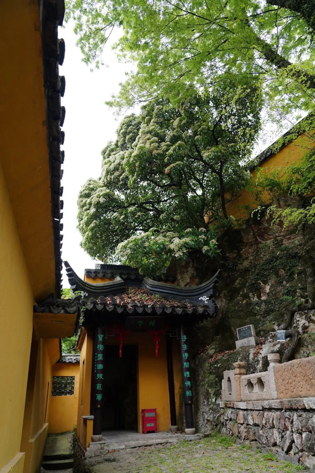 在他的侧前方,是一小亭,上有牌匾曰“隐秀”,一如这棵古石楠隐于大众视线之外,他的正前方便是一间佛殿的后门,能看到里面的部分陈设。或许,这棵古石楠在袅袅升起的香火朦烟与时断时续的诵经声中,也早已修成了一棵有着佛心的佛树。这数百年来,神佛庇佑前来祈愿的众生,古石楠树则伸展着浩荡的枝柯“庇佑”着神佛。