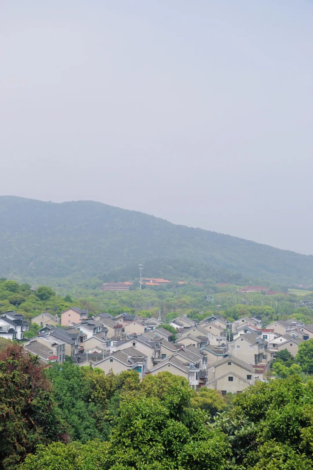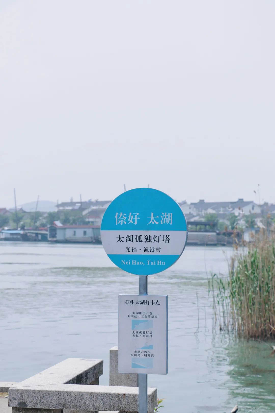 和宽尘法师聊完之后,我们又经由左侧的月洞门到了后山,看到了写有“憨山台”的石碑。还偶遇了坐落在山坳之间的一片闲居村落,令人不由得想起陶渊明笔下隐于山洞后的那片桃花源。下山时,我们路过了太湖的湖滨,这里依然还竖立着“太湖孤独灯塔”的蓝白色路牌,近处有几艘渔船静谧地停泊在港湾之内,稍远处就是灯塔以及密集的渔村建筑。如果时机合适,可以在这里拍到绝美的日落。