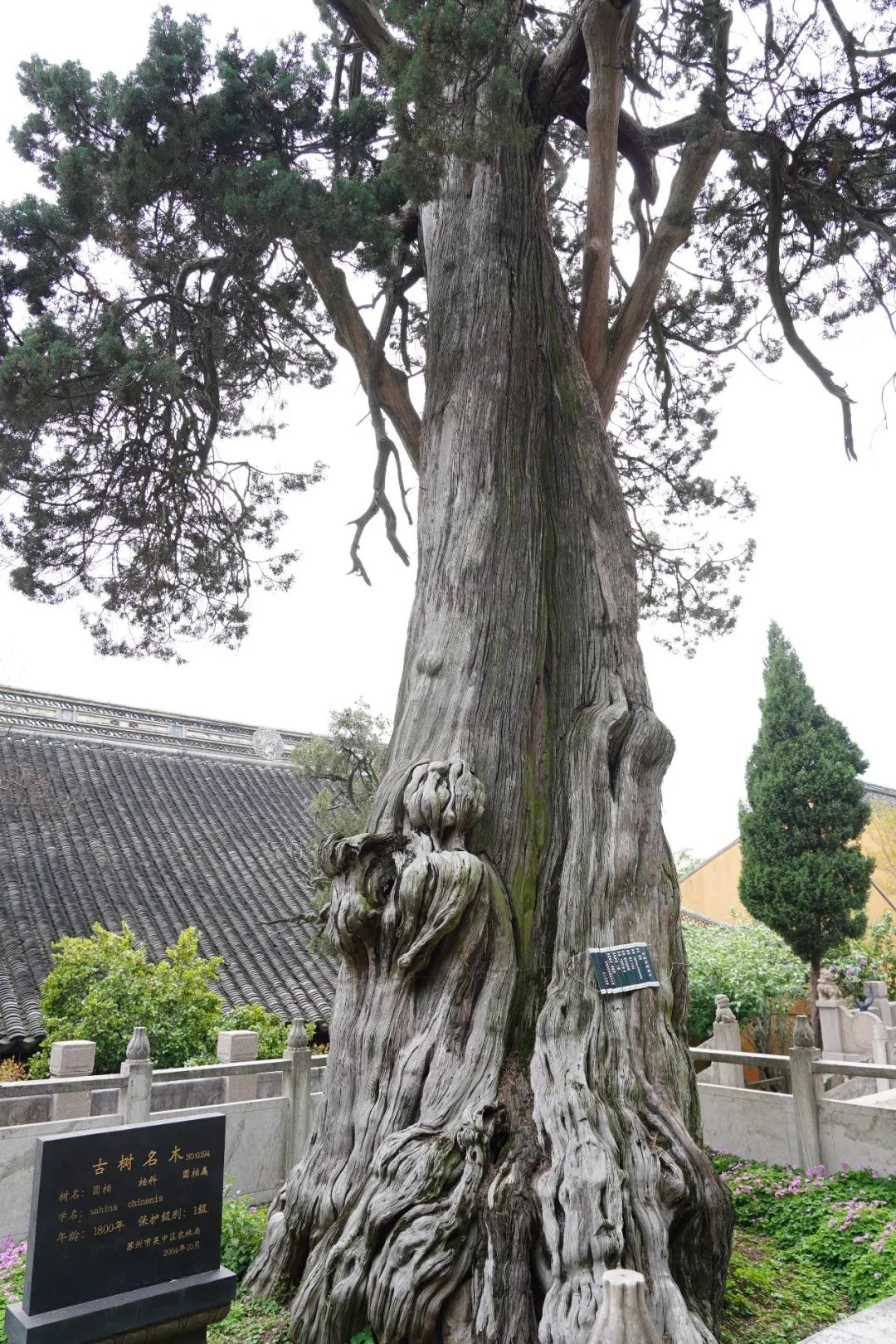 进门途径巍峨的钟楼,走过一段微曲向下延伸的连廊,就能目视到我们此次拜访的两位主角——编号分别为吴中194(约1800岁)、吴中195(约1500岁)的两棵参天晋柏。关于柏树的相关介绍,大家可以移步树碑立传专栏的另一篇官方推文——,在此也不再赘述。