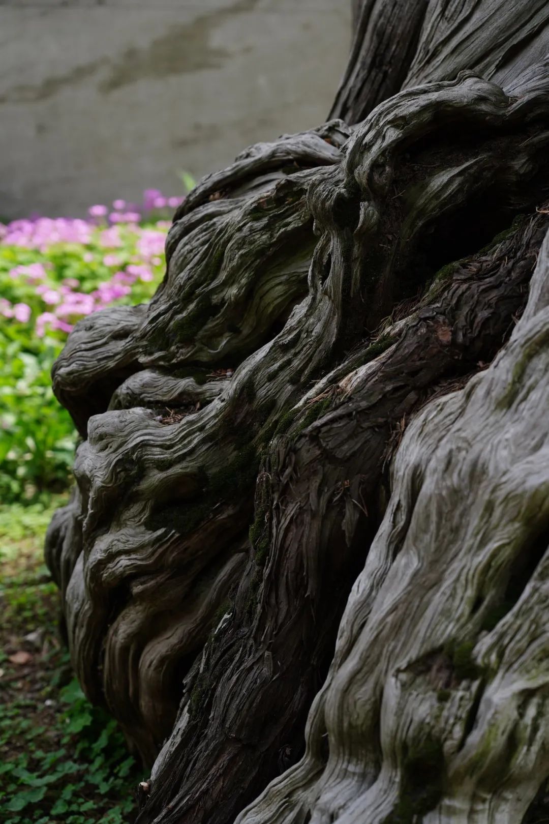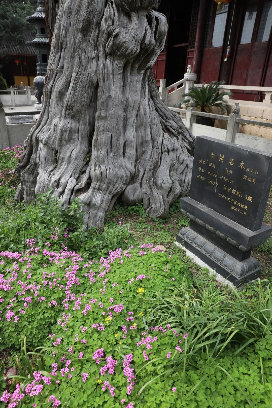 柏树种类众多,圣恩寺这两棵古柏种类属圆柏,位于壮观的大雄宝殿前。与永慧禅寺的石楠隐士不同,这两棵古柏无论是从所处地来说,还是其挺峻的形态来说,无疑更似两位驻守在殿前的将士,不眠不休地守了1000多年。在他们深沉的灰白色树根周围,开满了令人炫目的紫花酢浆草,好像春天这艘航船在这里找到了暂时的停泊之地。不过,他们毕竟不再年轻,多年的“风刀霜剑严相催”已在他们的树皮之上刻出了一条蜿蜒起伏、涌动不已的河流,凸出的树结就如刺水而出的岩石。