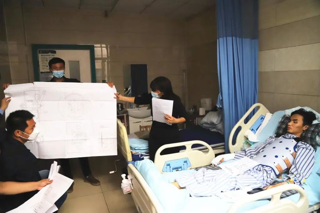当学校了解实际情况后,为了达成他顺利毕业的心愿,5月22日上午,机电工程学院副院长李莹莹、车辆工程教研室主任郭斌峰等一行5人来到病房,看望慰问林明欣同学,并开始了一场特殊的毕业答辩。
