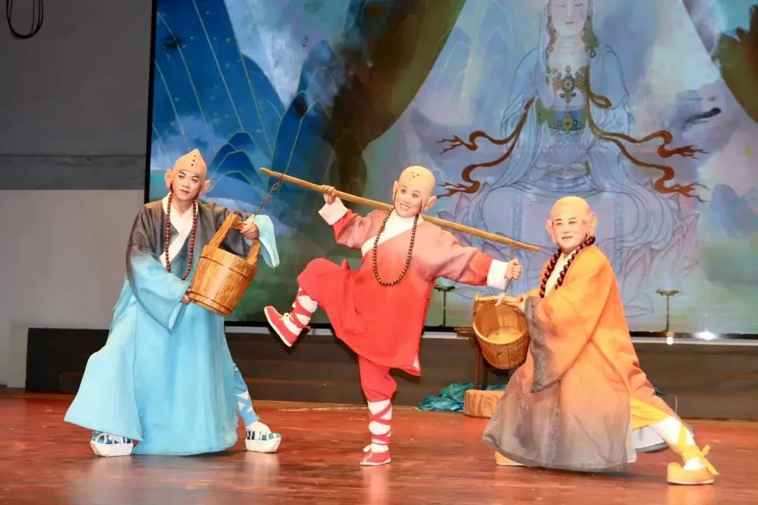 ▶ 演出简介: 该剧以《三个和尚》的经典故事为蓝本,进行加工创作,描绘了小和尚与蜜蜂戏耍、高和尚傻斗山鸡、胖和尚在水中与鱼虾螃蟹打闹,以及三个和尚为了打水互相推诿等有趣的剧情。