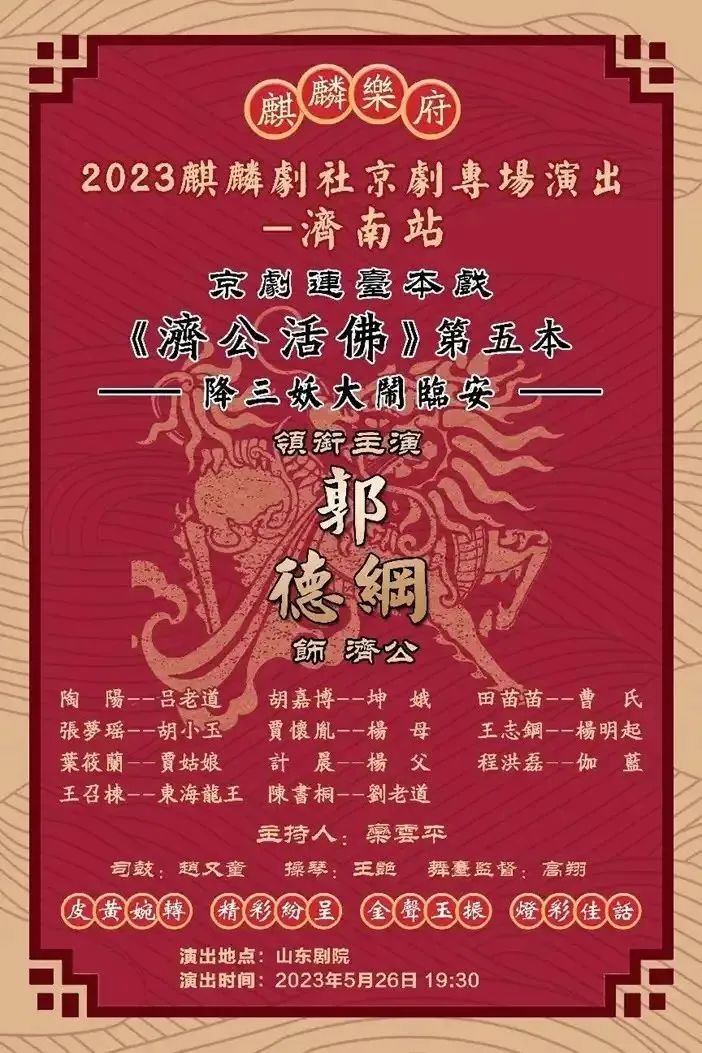 ▶ 演出简介:演出《济公活佛(第五本)》。临安府出现三个妖怪:穿山甲、蛇精和狐狸精,三妖兴风作浪,危害百姓,被济公一一降服。