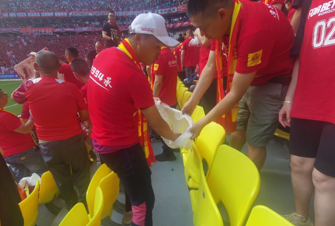 省球迷协会的会员们纷纷拾捡起身边的垃圾