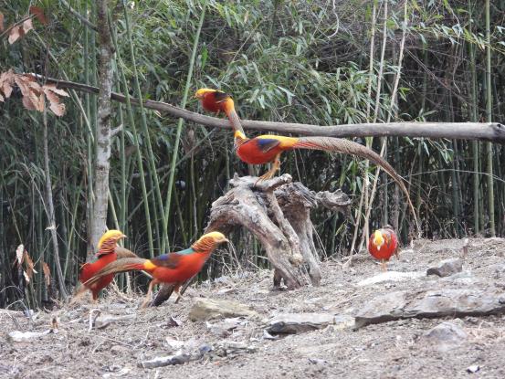“啯、啯、啯……”随着呼唤声响起,不一会儿,红腹锦鸡、橙翅噪鹛等鸟儿出现在镜头前啄食。