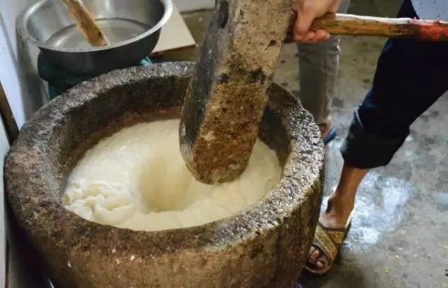 制作麻糍的工艺并不复杂,但很耗费力气和时间。首先需要将浸泡过的糯米蒸熟。然后得把蒸熟的糯米倒入石臼,用石杵或木杵连续锤打,直至糯米饭完全变成糊状。