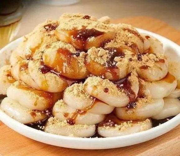 最常见的叫米筛花,等舂好的麻糍热气散尽,在米筛上摁成扁圆形。这种麻糍表面印有米筛的花纹,因而得名。街头叫卖的大多是这种麻糍。