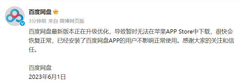 @百度网盘 6月1日发布消息称,百度网盘最新版本正在升级优化,导致暂时无法在苹果APP Store中下载,很快会恢复正常,已经安装了百度网盘APP的用户不影响正常使用。