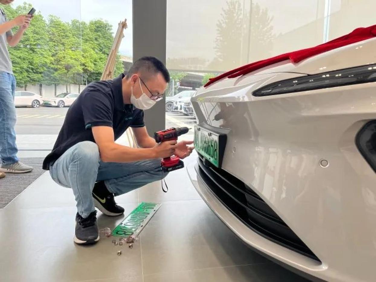 他在4S店将邮寄过来的牌照上好