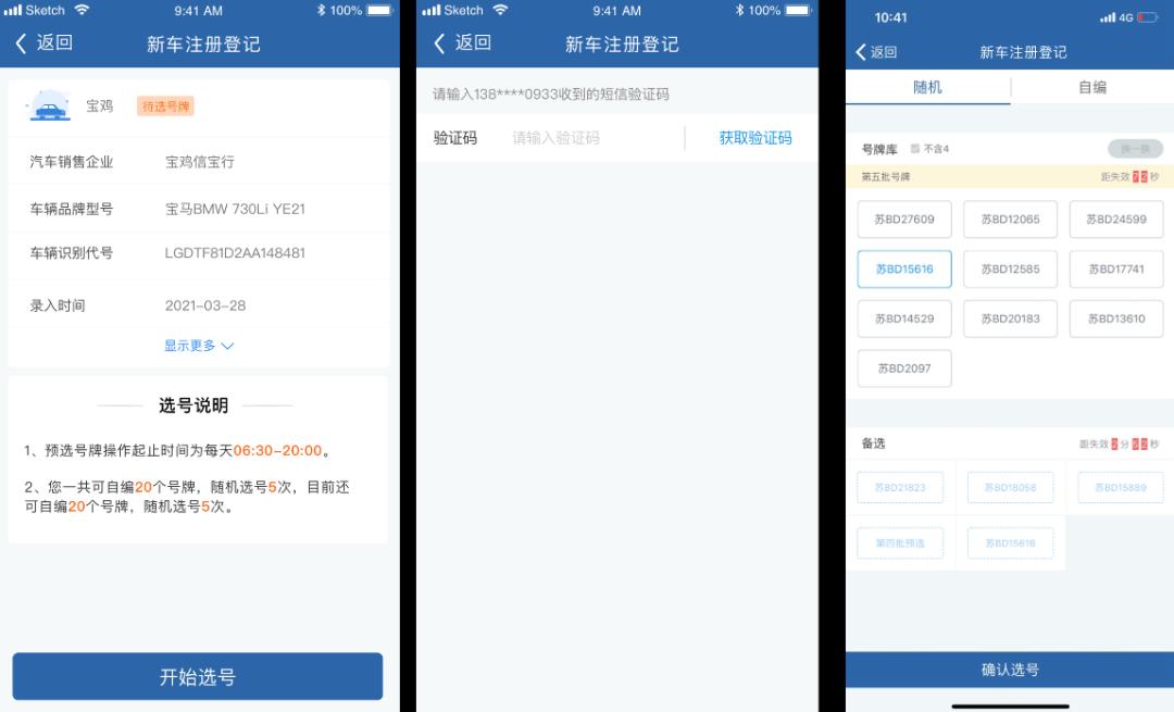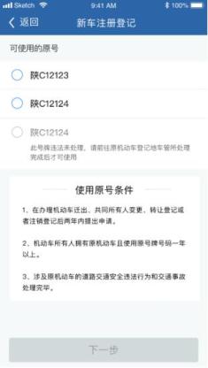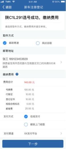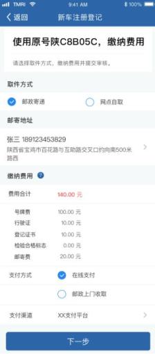 线上业务办理流程1、机动车所有人通过“交管12123”APP线上申请注册登记。填写相关信息并选号,缴纳牌证工本费、邮寄费。