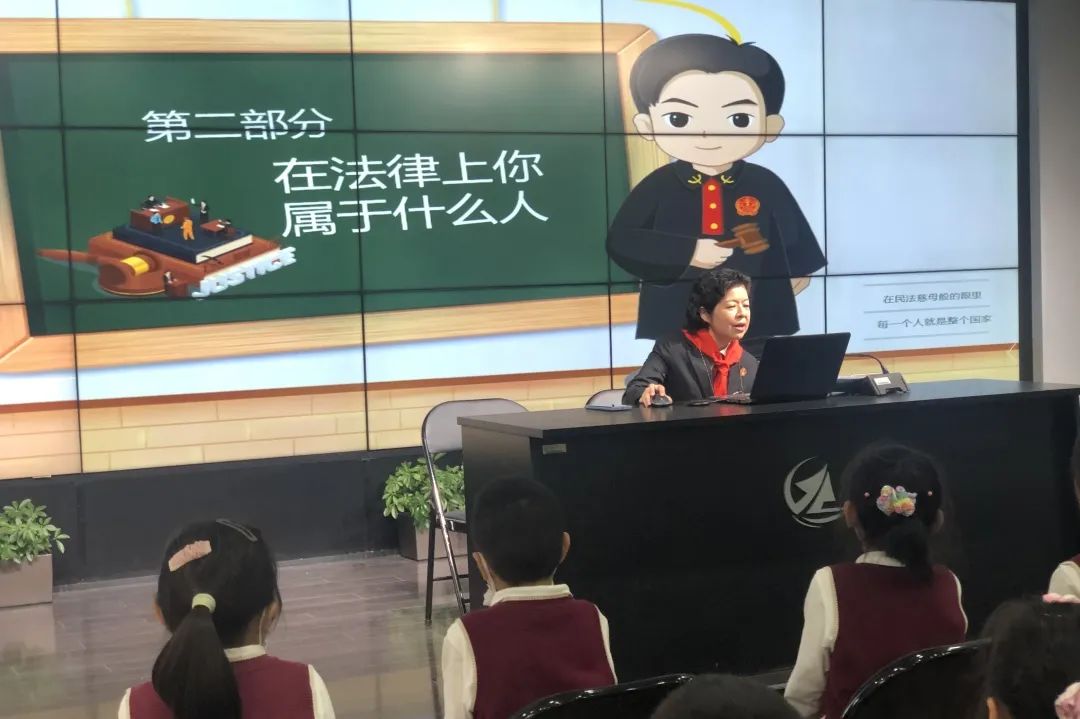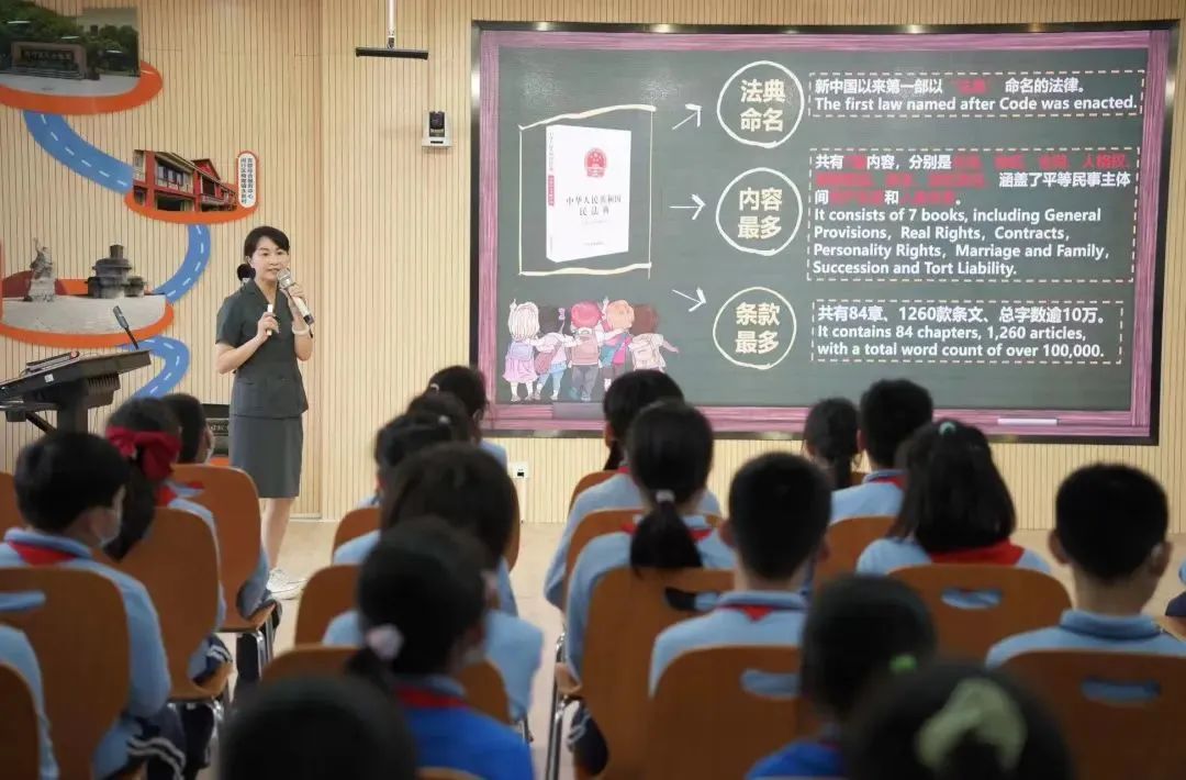 在七宝实验小学的课堂上,审判监督庭陈淋清法官通过问答的方式与“乐乐们”亲切互动,以“你们心目中的法是什么?”、“哪些法与我们青少年相关?”、“法官和法院是做什么的?”、“《民法典》有什么特别之处?”、“《民法典》是如何保护我们青少年的?”5个问题以点带面的方式讲解了什么是法、法院和法官、民法典与其他法律法规的不同之处、其编纂历程、民法典如何保护未成年人以及学习民法典的意义。