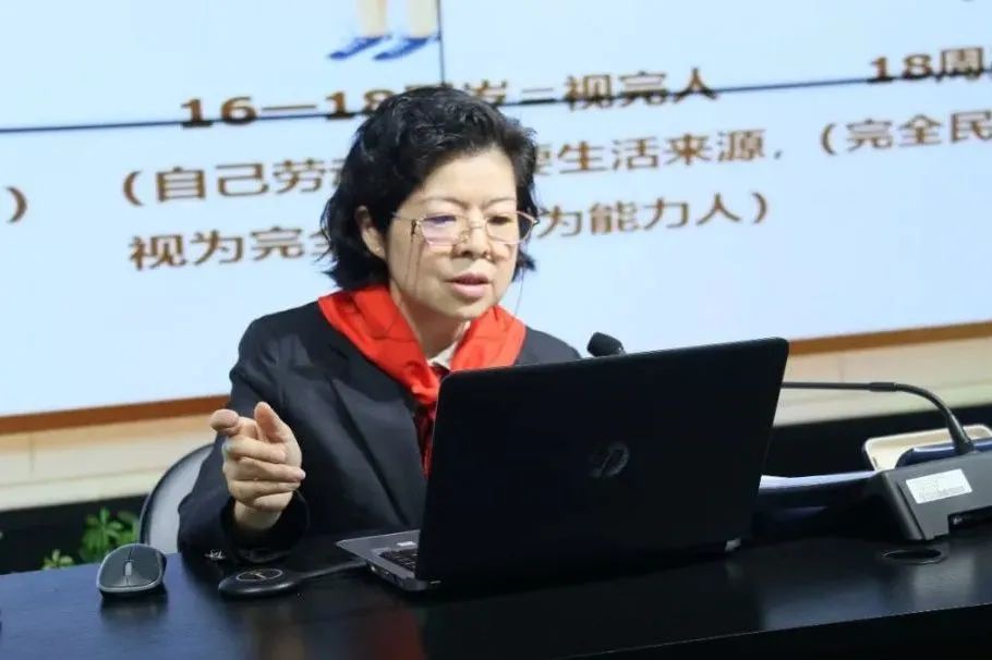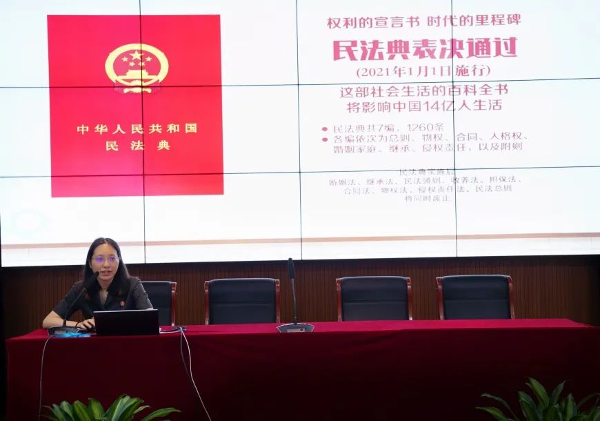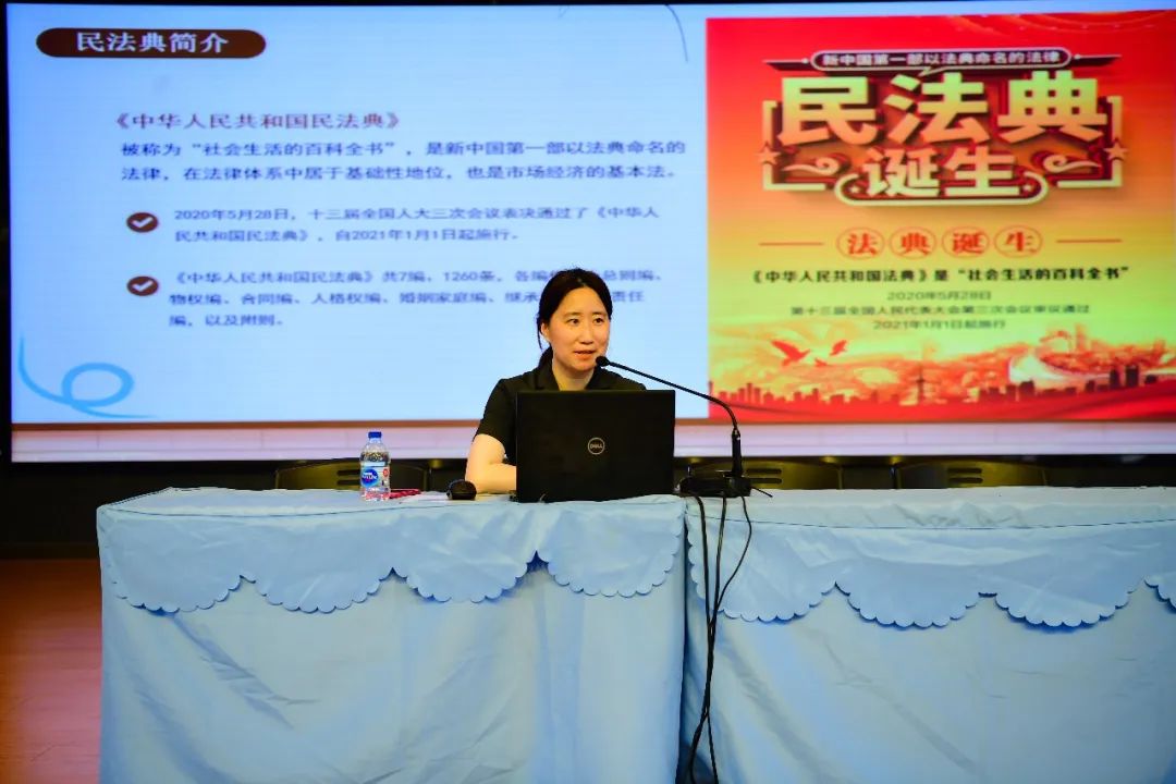 讲座伊始,民事审判庭(知产团队)施蕾法官首向师生们介绍了《中华人民共和国民法典》出台背景及重要意义。《民法典》被誉为“社会生活的百科全书”,针对民法典对人的规定,施蕾法官介绍了不同阶段的人在法律上的划分要求及享有的权利进行解读。