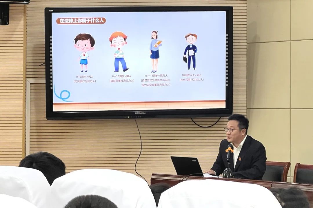 最后,吴法官强调未成年人是《民法典》重点保护的群体之一,着重讲解了在《民法典》中保护未成年人权益的四个重要时间节点所具有的法律意义,又结合实际,举了9个具体形象的例子,用深入浅出的语言带领同学们认识到《民法典》在日常生活中是如何保护自己的。