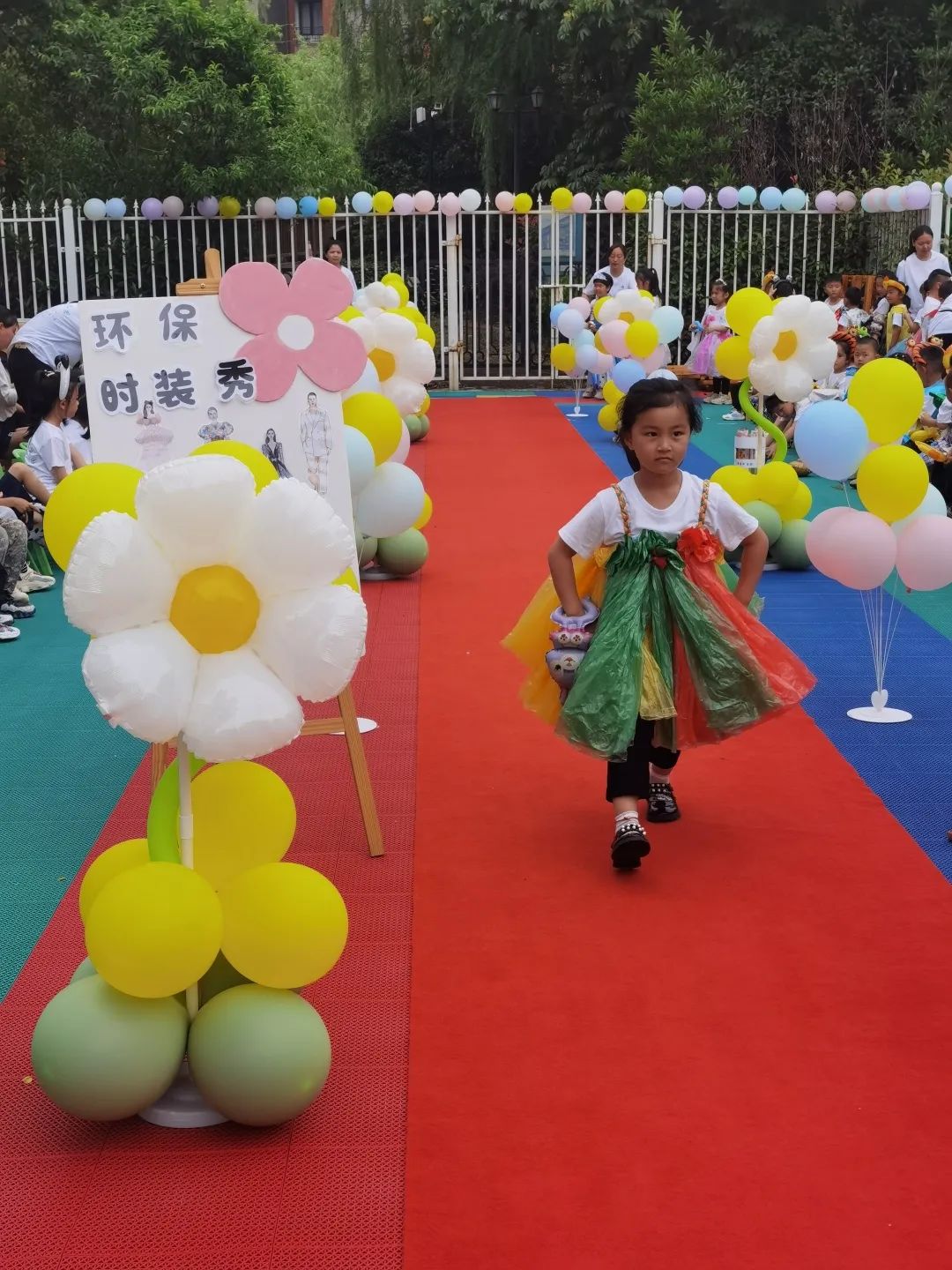 活动前期,家长和孩子们都用心地准备,全家齐上阵,纷纷利用家中的报纸、布料、旧衣服、树叶、纸盒、塑料袋等废旧材料共同设计孩子眼中最“靓”的服装。在制作过程中,经过家长和孩子们的匠心巧手一瞬间变成了一套套精美的环保时装。每件作品都形象健康、环保、生动、活泼,富有创意,表达了绿色环保理念,展示幼儿及家长的风采。一件旧衣服、一个环保袋、一张废旧纸、甚至是一个小杯子……就是这些生活中不起眼的废旧物品,在孩子和家长们的奇思妙想和巧手打造下,变成了一件件童趣盎然的创意服装,有帅气又不失可爱的蝙蝠侠披风,也有漂亮充满童趣的垃圾袋裙子,更有用环保袋制作的消防制服,随着动感十足的音乐节奏,时装秀上正式拉开序幕,孩子们气场全开,在富有节奏的音乐中摆出最美、最酷的姿势,将自己的设计完美地展示出来。