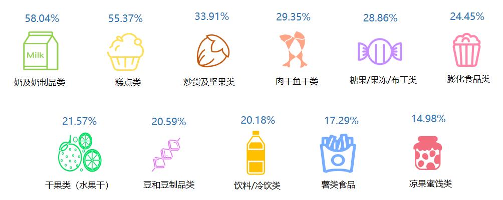 主要选择奶及奶制品、糕点类零食,占比均超过五成,其次是炒货及坚果类、肉干鱼干类,分别占比33.91%和29.35%。