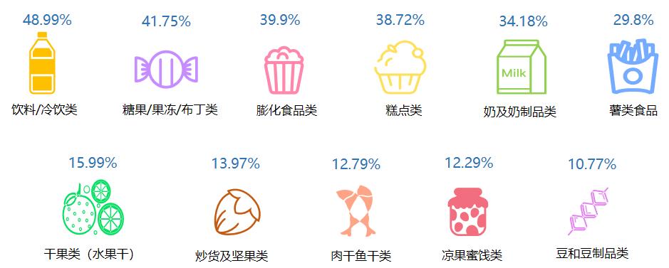 主要会选购“饮料/冷饮类”、“糖果/果冻/布丁类”以及“膨化食品类”,占比为48.99%、41.74%及39.9%。