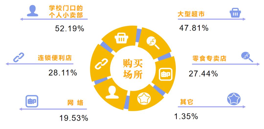 52.19%的受访儿童表示会在学校门口的小卖部购买零食,其次的选择是大型超市、连锁便利店、零食专卖店。