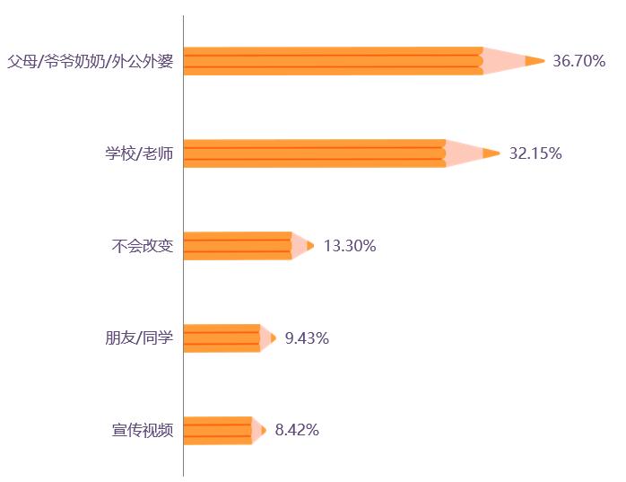 儿童购买零食的场所36.70%的受访儿童表示最可能让自己改变零食购买习惯的是“父母/爷爷奶奶/外公外婆”,其次是“学校/老师”,有13.30%的受访儿童表示不会改变购买习惯。