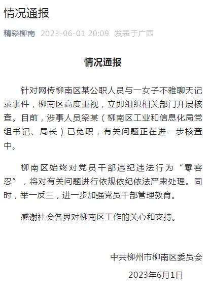 广西柳州市柳南区委宣传部微信公众号“精彩柳南”6月1日发布《情况通报》:针对网传柳南区某公职人员与一女子不雅聊天记录事件,柳南区高度重视,立即组织相关部门开展核查。目前,涉事人员梁某(柳南区工业和信息化局党组书记、局长)已免职,有关问题正在进一步核查中。