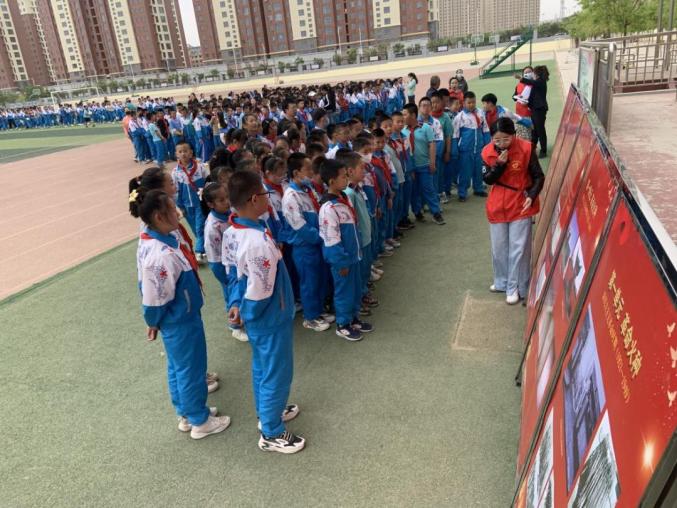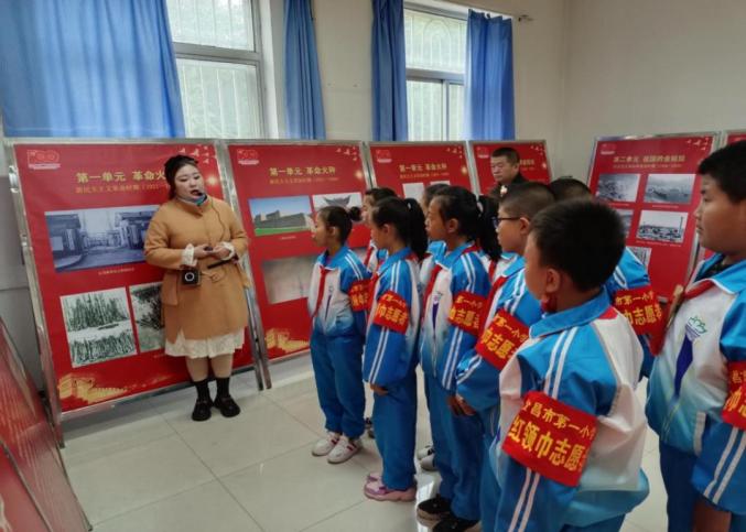 讲解员老师给金昌市第一小学的孩子们讲解红色流动展板