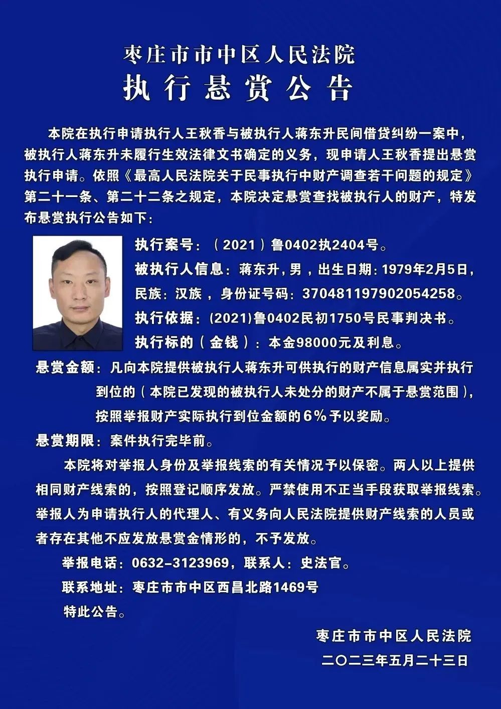 枣庄市市中区人民法院发布执行悬赏公告