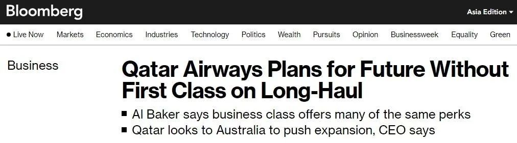 据彭博社报道,卡塔尔航空CEO Akbar Al Baker表示,该航司的下一代远程客机将不再提供头等舱座位,其表示,卡塔尔航空的商务舱已提供许多与头等舱相同的福利,投资头等舱座位无法证明会有同等的回报。