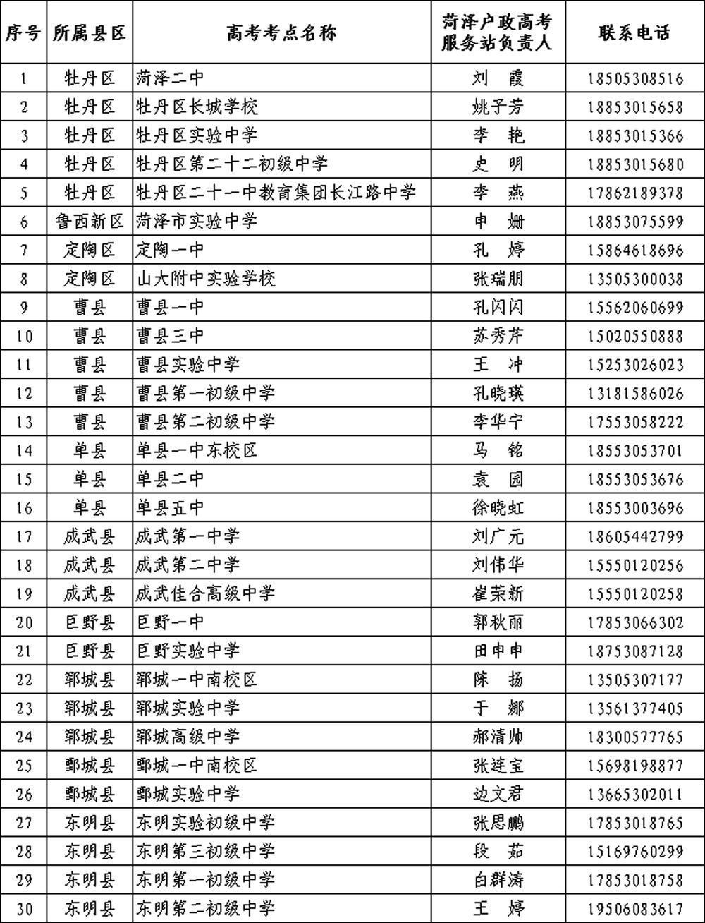记者从市公安局了解到,考试期间,菏泽公安户政高考服务站将进驻全市所有高考考点,并公布了负责人及联系方式,如果考生发现忘带、丢失身份证,可立即联系表中所在考点户政高考服务站负责人,执勤民警将提供“现场受理、快速出具”临时身份证明服务。该证明与身份证具有同等法律效力,可用于证明考生本人身份参加高考。