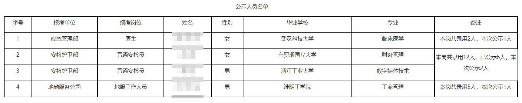 近期,温州机场集团发布的2023年春季招聘拟录用人员公示受到舆论关注。根据该公示,河南理工大学土木工程专业的别某、浙江大学动物科学专业的陈某、浙江理工大学建筑学专业的邱某拟被录用为“场务及驱鸟员”。另外,温州机场集团拟录用伦敦大学皇家霍洛威学院工商管理专业的林某、白俄罗斯国立大学财务管理专业的洪某为安检护卫部普通安检员,同一岗位拟录用的其余人员来自浙江海洋大学东海科学技术学院、重庆大学城市科技学院、集美大学诚毅学院等。