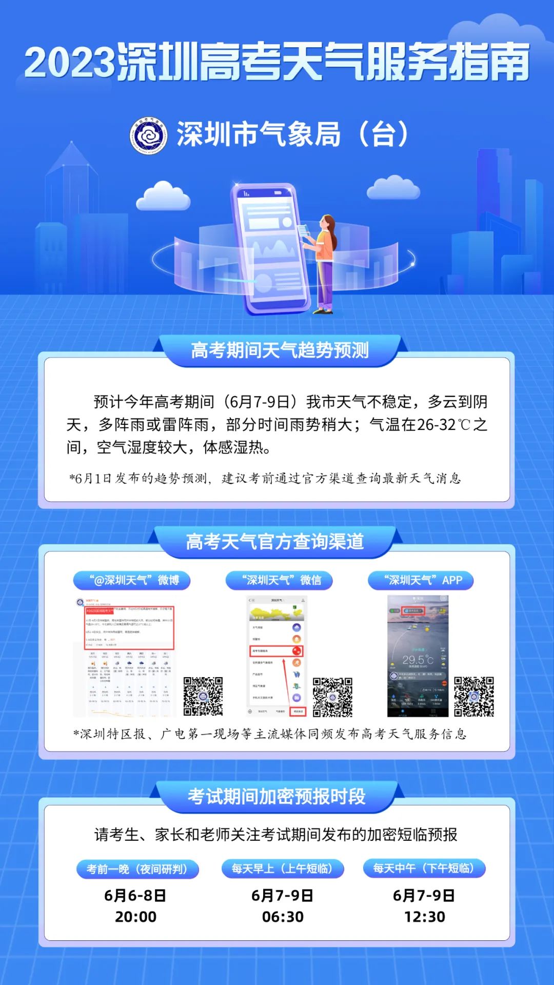 高考期间(7-9日)我市天气总体不稳定,多阵雨或雷阵雨。高考首日(7日)有雷阵雨,部分时间雨势较大,8-9日有短时(雷)阵雨,部分时间雨势较大。请考生家长及时关注深圳气象台发布的最新预警预报信息,妥善安排赴考行程。