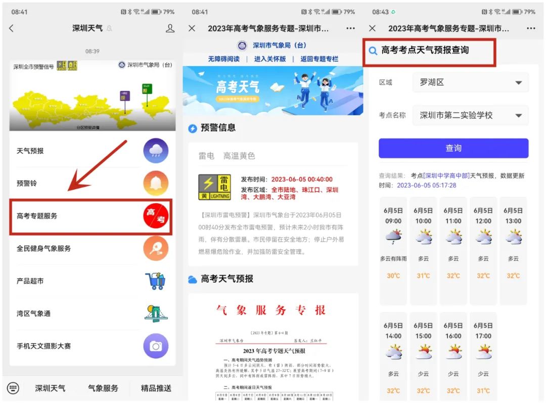 不仅能查询高考期间天气趋势,还能通过搜索考点名称,精准查询高考考点的天气预报。