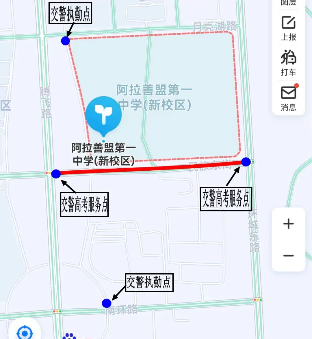 1、民族东路阿拉善盟第一中学(新校区)门前路段(东环路与民族东路交叉路口至民族东路与腾飞大道交叉路口)禁止社会车辆通行、停放。(管制时间:7日、8日早晨7:20至下午17:50,9日早晨7:20)如下图:红线为管制路段。