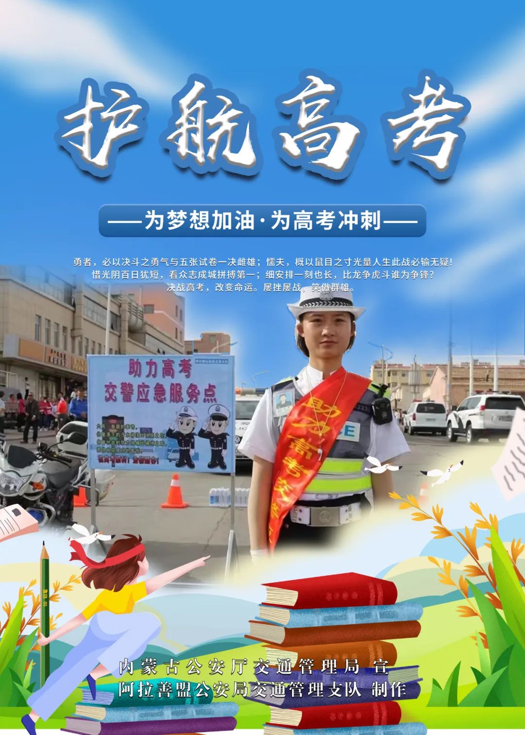 如您在高考期间遇到困难时,可向执勤民警求助或拨打阿拉善右旗公安局交通管理大队报警电话0483-6025122