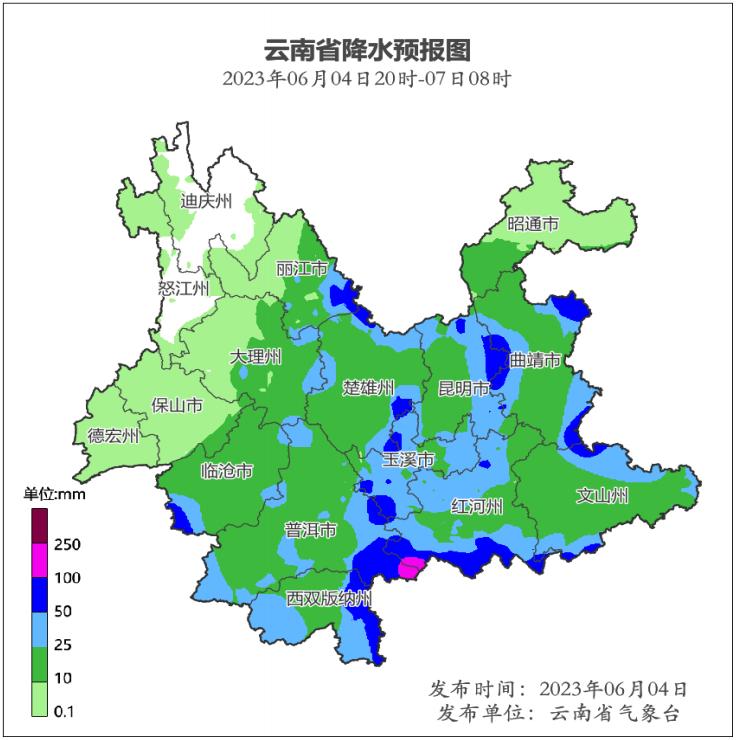 6月4日夜间至5日:昭通市南部、曲靖市、昆明市、楚雄州、丽江市中东部、玉溪市、文山州、红河州、普洱市、西双版纳州有中雨局部大雨、暴雨。