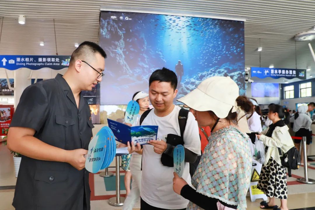 本次活动以“守护这片海 我们在行动”为主题。座谈会上,陈德雄一行听取了蜈支洲岛景区海洋环境保护基本情况,双方就如何加强沟通协作、凝聚环境资源保护工作合力等问题进行了深入讨论。陈德雄表示,要始终坚持“生态环境保护优先、预防为主、综合治理、公众参与”的理念,以更高的政治站位、更深的为民情怀,担当作为,能动司法,为打造岛绿、滩净、水清、物丰的人岛和谐“和美”新格局贡献法院力量。随后,环资庭干警在景区内通过摆放法律咨询台、悬挂横幅、发放宣传手册的方式,向过往人群宣传讲解环保法律法规、生物多样性保护等环保常识,重点介绍了玳瑁、绿海龟、砗磲、中华鲎、海马、锦绣龙虾等禁止捕捞的国家重点保护野生动物,倡导大家从自身做起、从小事做起,以实际行动保护海洋生态环境。虽然烈日炎炎,但很多游客都表现出对海洋生态环境保护知识的高度热情,纷纷上前咨询各种法律问题,法院干警一一耐心解答。