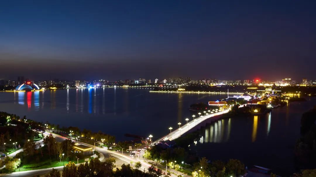 中华路徒骇河大桥的桥塔造型在设计的时候,便融合了水城的概念,将一颗圆润的明珠托举在空中旋转,朦胧的夜色之下,现代的霓虹灯柔和又绚烂。