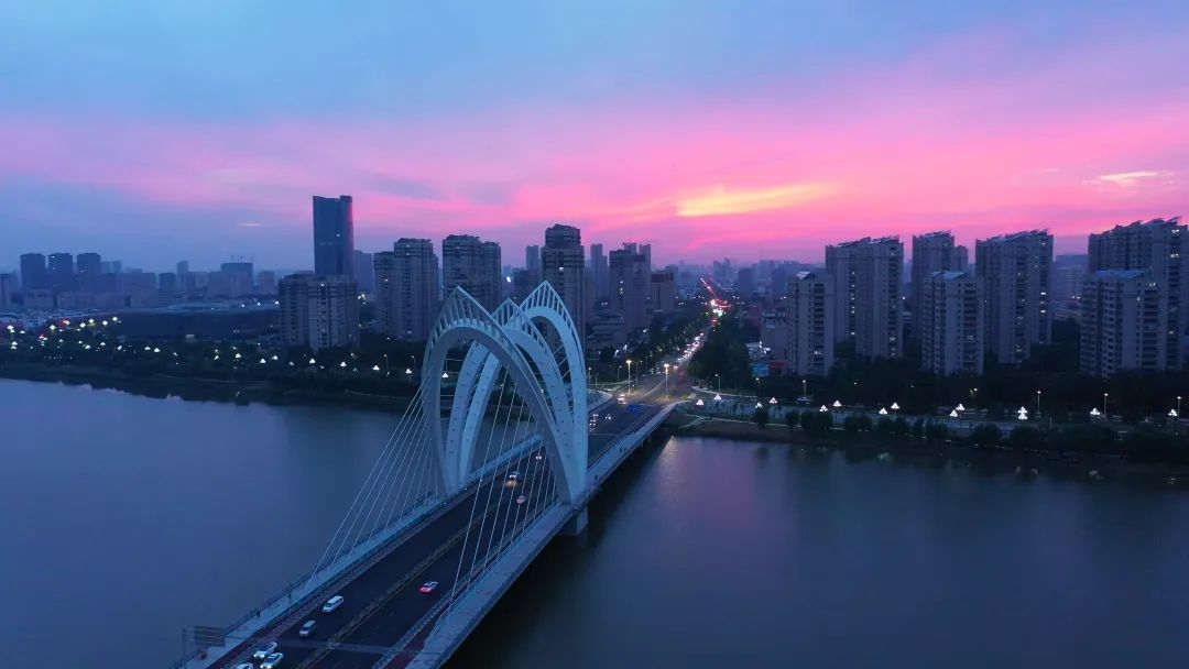 宏伟大气的湖南路大桥,桥身两岸有两根对称的主缆和37对吊索,犹如琴弦,车水马龙的声音就好像这座城市的交响乐曲,歌颂着城市的飞速建设与发展。