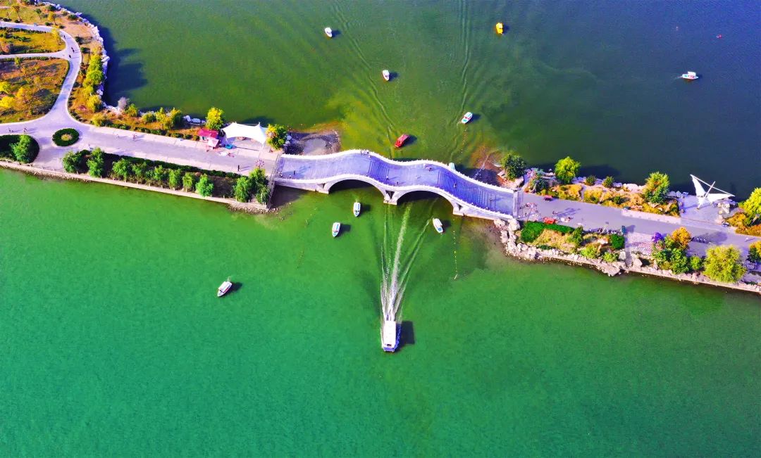 北京颐和园有著名的十七孔桥,而我们有座二十一孔桥,这桥孔孔相连,左右对称,因为有二十一孔,象征着跨越二十一个世纪,故得名二十一孔桥。